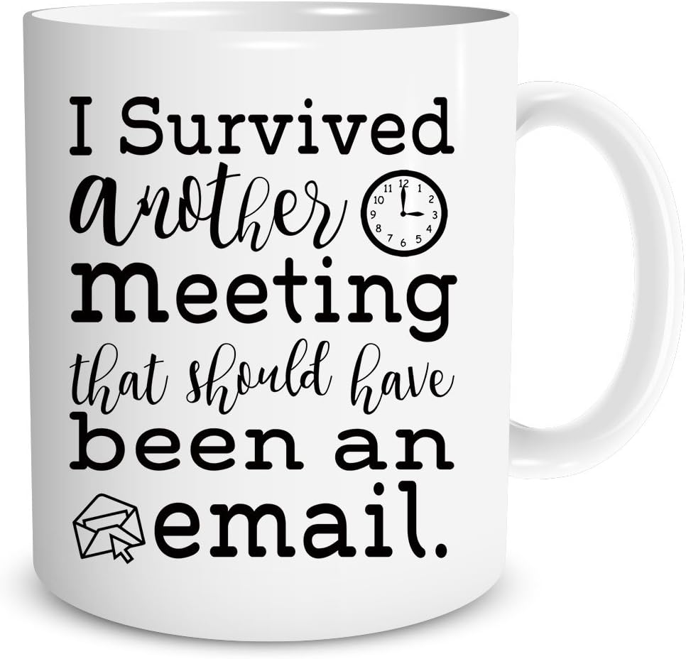 Looking for funny white elephant gifts under $10? This is perfect! Who wouldn’t relate to this survivor’s tale? “I survived another meeting that should have been an email”.
